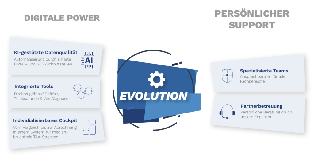Mit unserem Beraterportal EVOLUTION stellen wir Ihnen eine zentrale Arbeitsumgebung für sämtliche Prozesse zur Verfügung. Medienbrüche gehören der Vergangenheit an.